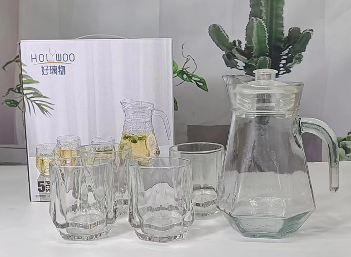 5-Piece Geometric Glass Pitcher and Tumbler Set – Modern Faceted Carafe & Drinking Glasses for Home and Kitchen