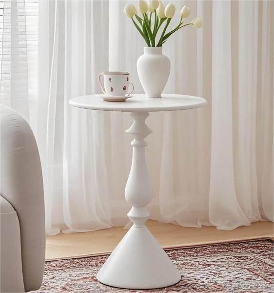 Sculptural White Pedestal Side Table | Modern Designer Bobbin Accent Table with Cone Base