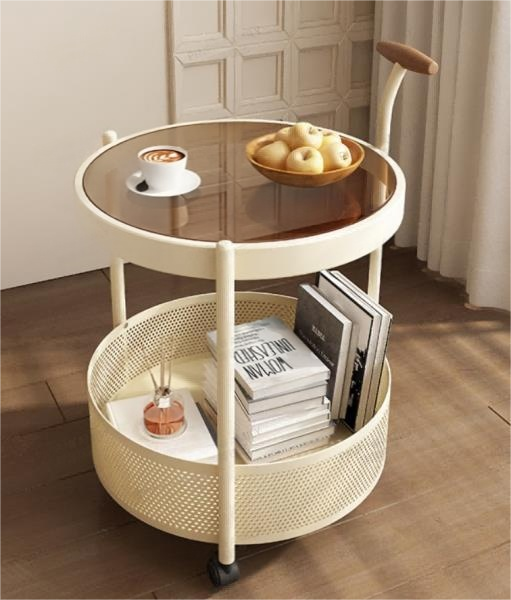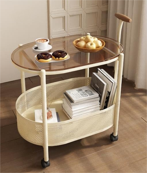 Aesthetic Cream Rolling Serving Cart with Glass Top – Nordic Two-Tier Mobile Trolley for Coffee, Bar, or Cozy Living Room Decor
