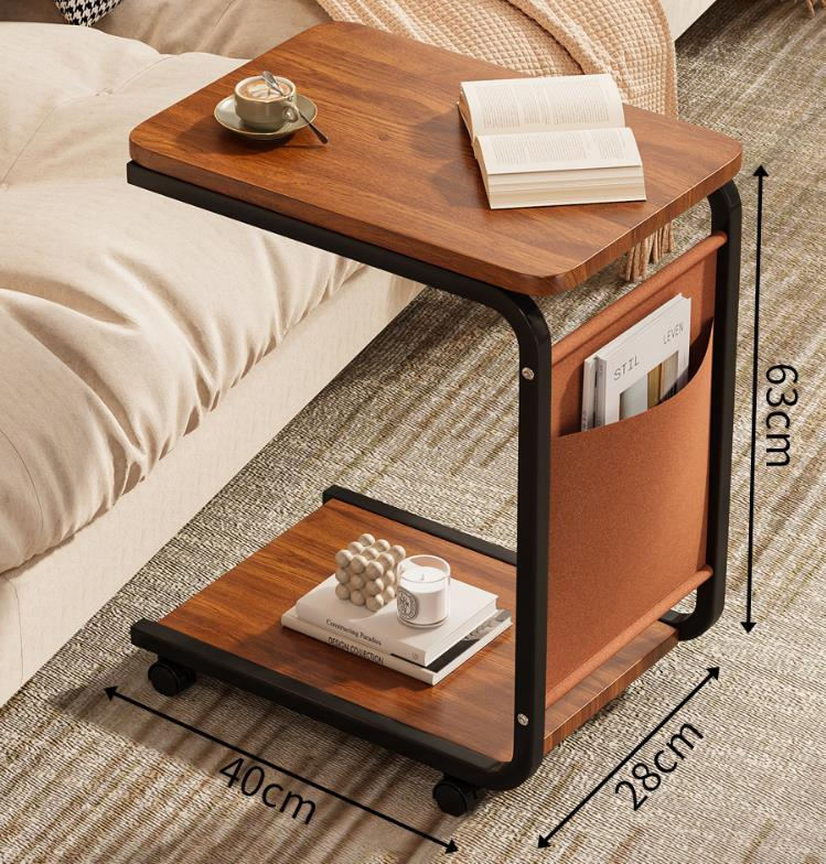 C-Shaped Rolling Sofa Side Table with Storage Pocket | Wood Grain Top and Black Frame