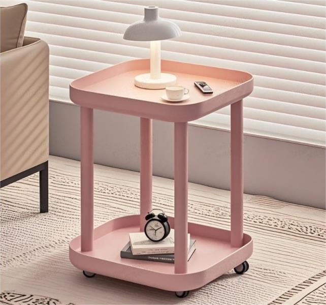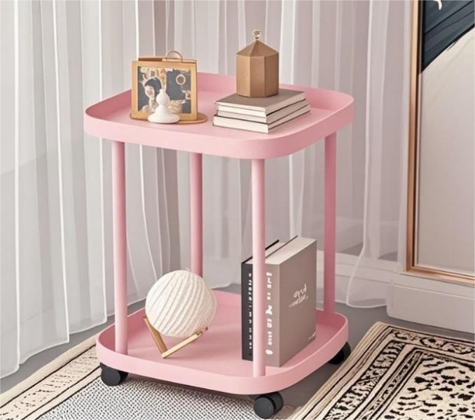 Charming Pink Rolling End Table with Dual Trays – Aesthetic Kawaii Side Table for Girls’ Bedroom, Dorms, and Playful Decor