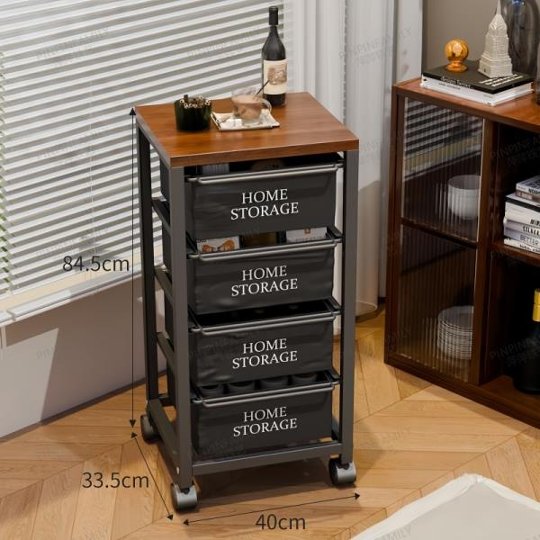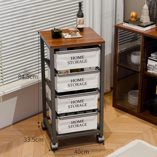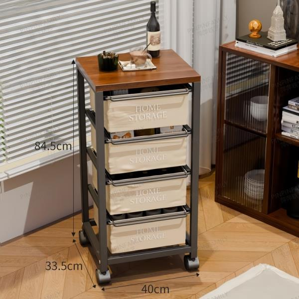 The cart features four deep fabric drawers, providing ample storage space for all your essentials. The drawers are perfect for stowing away snacks, books, office supplies, or craft materials. The sturdy wooden top offers a convenient surface for a lamp, a plant, or your favorite beverages, making it a functional end table or side table.