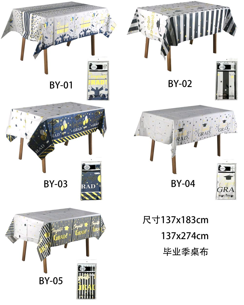 Festive Graduation Designs Featuring classic graduation motifs like caps, diplomas, and “GRAD” text, this tablecloth is designed to set a celebratory mood. The black, white, and gold color scheme adds a sophisticated touch to your commencement celebrations.