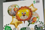 This delightful 5-pack of foil balloons is the perfect way to create a memorable jungle-themed party. The set includes a large, adorable lion balloon as the centerpiece, along with complementary balloons featuring cheerful elephants, monkeys, and giraffes, and two gold star-shaped balloons. These vibrant and playful designs are sure to be a hit with kids and create an unforgettable atmosphere.