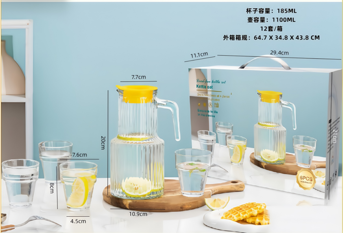 This 5-piece glass water pitcher set is a perfect blend of modern design and practical function for your home. The set includes a beautifully crafted ribbed glass pitcher and four matching tumbler glasses. The unique lemon filter lid with a vibrant yellow accent makes it easy to infuse your water with fruit while keeping pulp and ice in the pitcher.