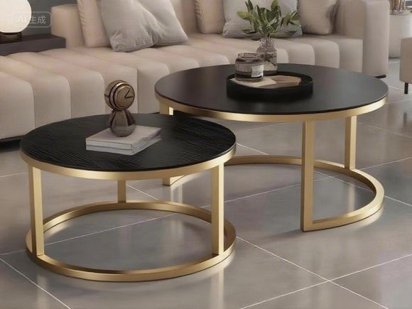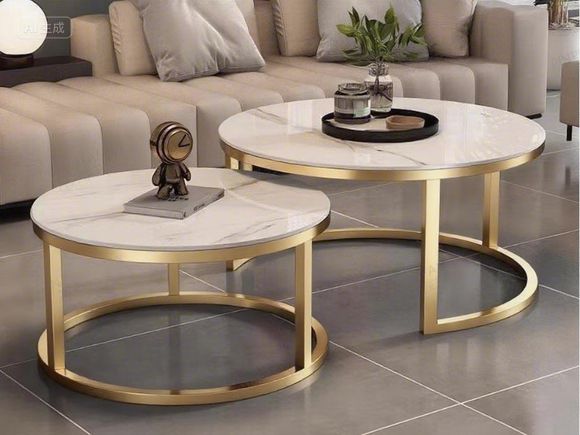 Luxury Round Nested Coffee Table Set with Wood Top and Gold Metal Frame
