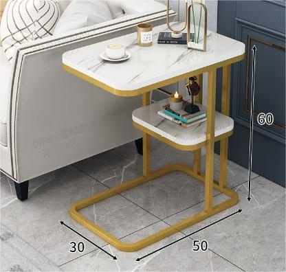 Luxury Gold C-Shaped End Table with Dual White Faux Marble Tiers – Modern Over-the-Couch Side Table for Glamorous Living Room Decor