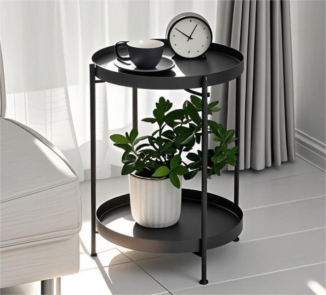 Matte Black 2-Tier Round Metal Side Table – Industrial Nightstand