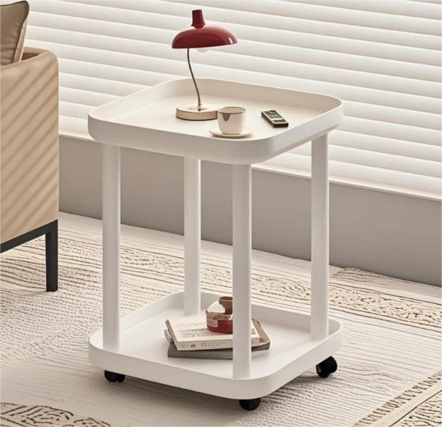 Minimalist White Square Mobile End Table with Casters, 2-Tier Storage Accent Table for Small Spaces