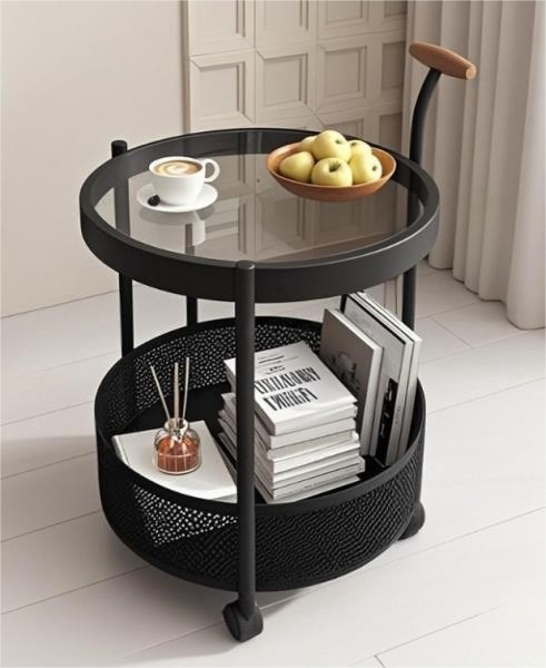 Modern Black Round Bar Cart with Glass Top & Storage Basket – Industrial Rolling Service Trolley for Home, Kitchen, or Living Room