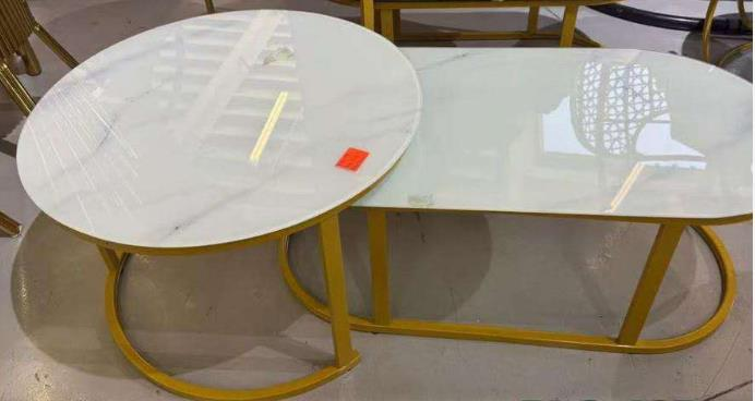 Modern Asymmetrical Nesting Coffee Table Set of 2 | Gold Frame and White Faux Marble Tops