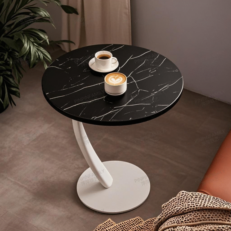 High-Contrast Black Faux Marble Round Side Table with White Curved Pedestal Base, Modern Art Deco Accent End Table