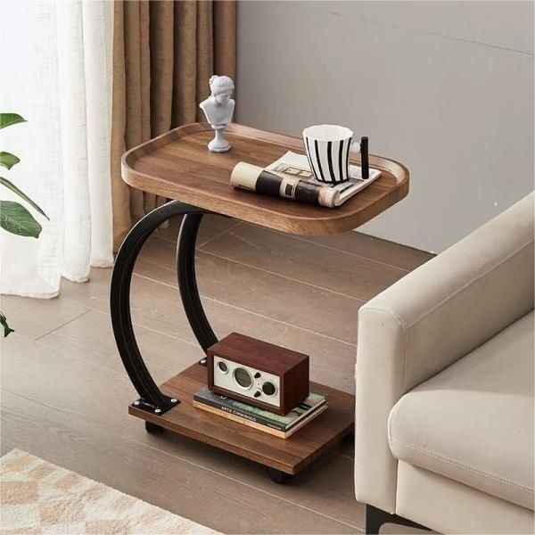 Industrial C-Shaped End Table with Rolling Casters – Modern Walnut Wood Snack Table for Sofa and Small Spaces